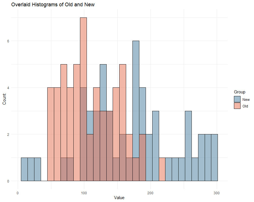 title = "시험 결과 분포 비교: Old vs. New",